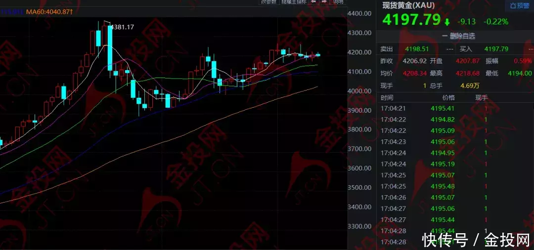 隔夜,现货黄金震荡上行,最终收涨0.39%,最终收报于4206.59美元。今日欧市盘中,黄金窄幅震动,目前在4196美元附近徘徊。